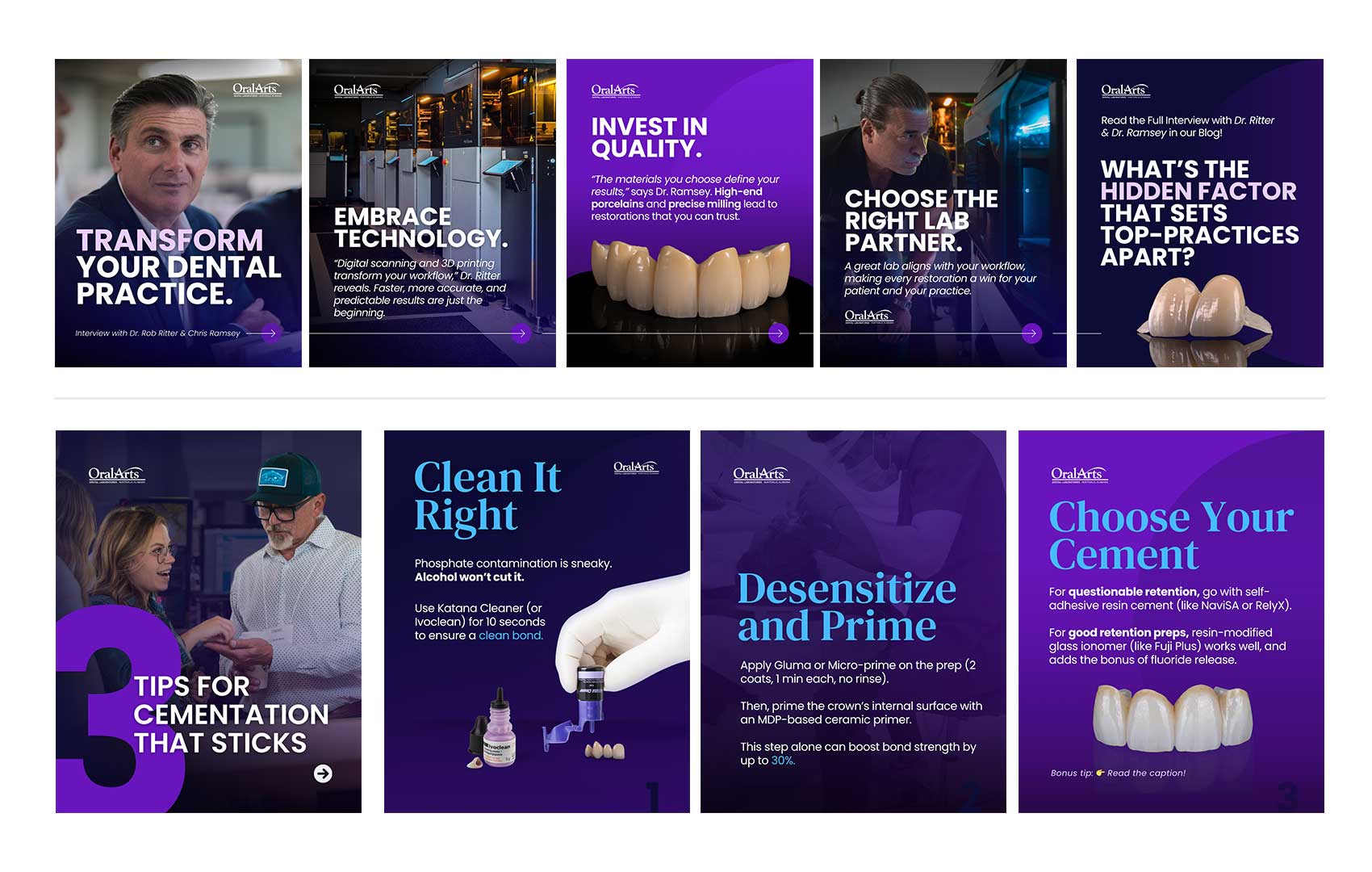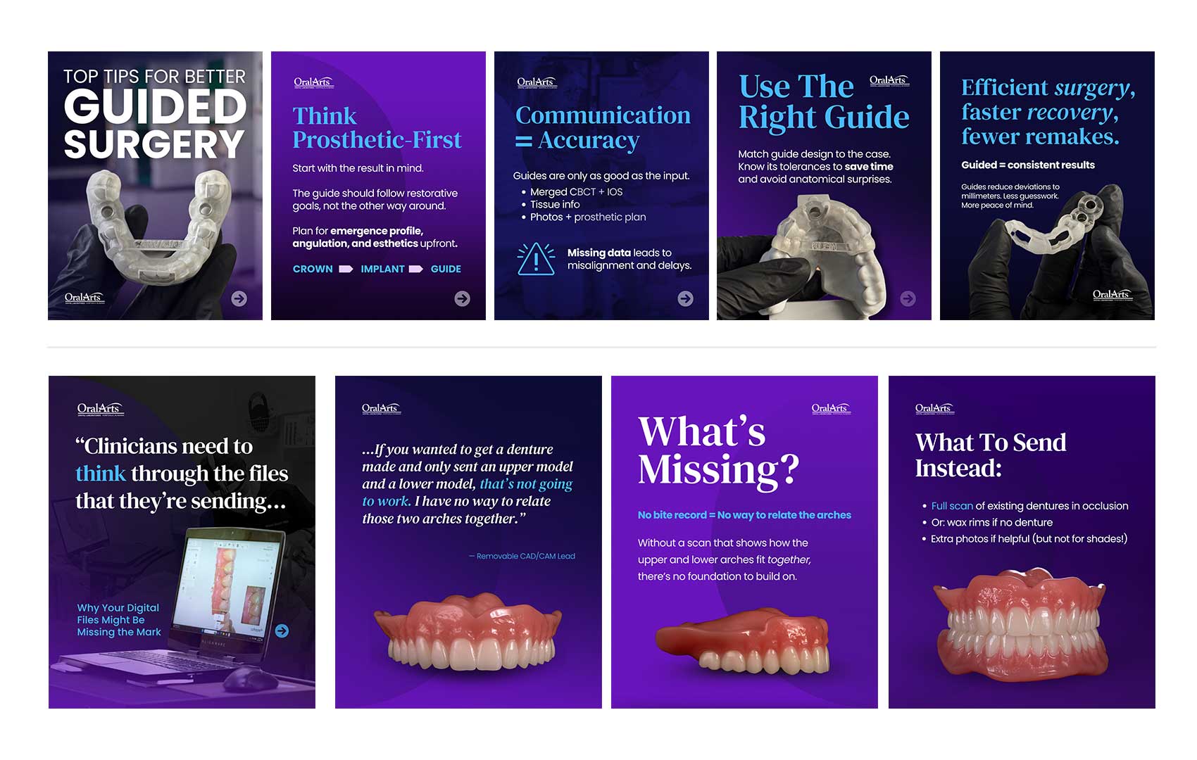 Daily social media management and content creation dedicated to connect with dental prodessionals. Posts focus on building trust, showcasinng the lab’s expertise, and supporting lead generation while maintaining a consistent brand presence across platforms.