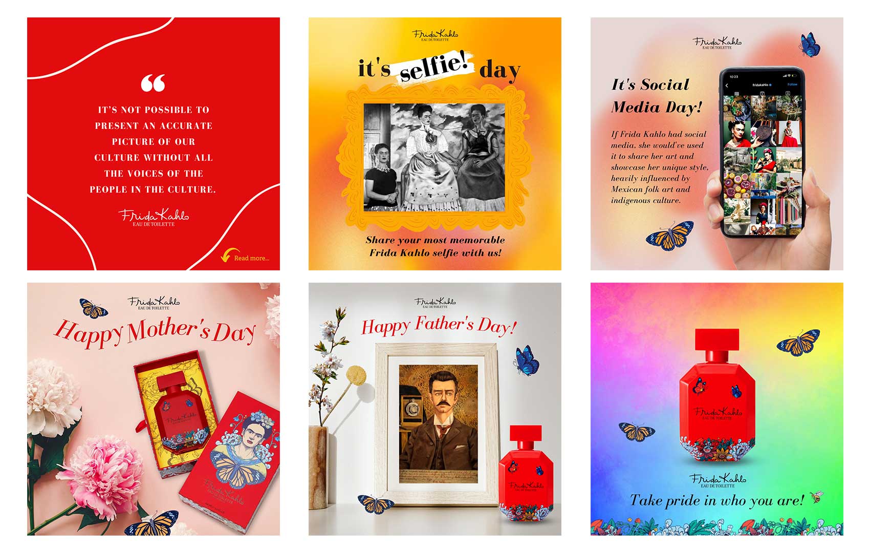 Posts focused on evoking the spirit of Frida through imagery and design, building a distinct brand voice and aesthetic that connected with audiences across platforms.